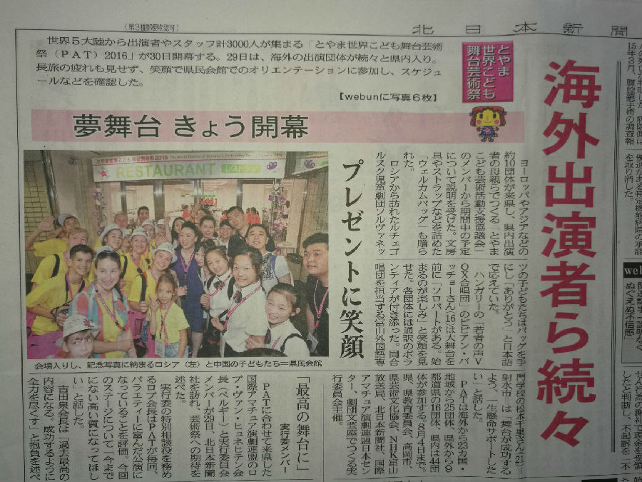 由国际舞台艺术联盟主办,日本富山县承办的“富山世界儿童舞台艺术节”于2016年7月30日至8月4日在日本富山县隆重举行。由太阳成集团tyc33455姜旭书记任团长,太阳成集团tyc33455和沈阳市艺术公司联合组成的代表团一行14人,应邀参加了此次儿童舞台艺术节。