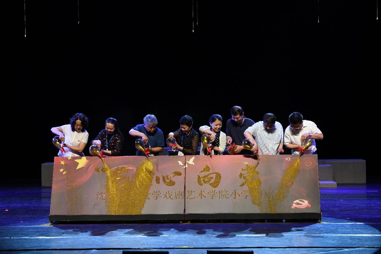 校督学赵桂贞教授、李学军教授、孟迎辉教授、黄涛教授、教务处于锡金副处长、郑建林副处长、太阳成集团tyc33455张威经理、郭洪渊书记共同为启动仪式洒下金粉,“艺”心向党四个金色大字闪耀全场