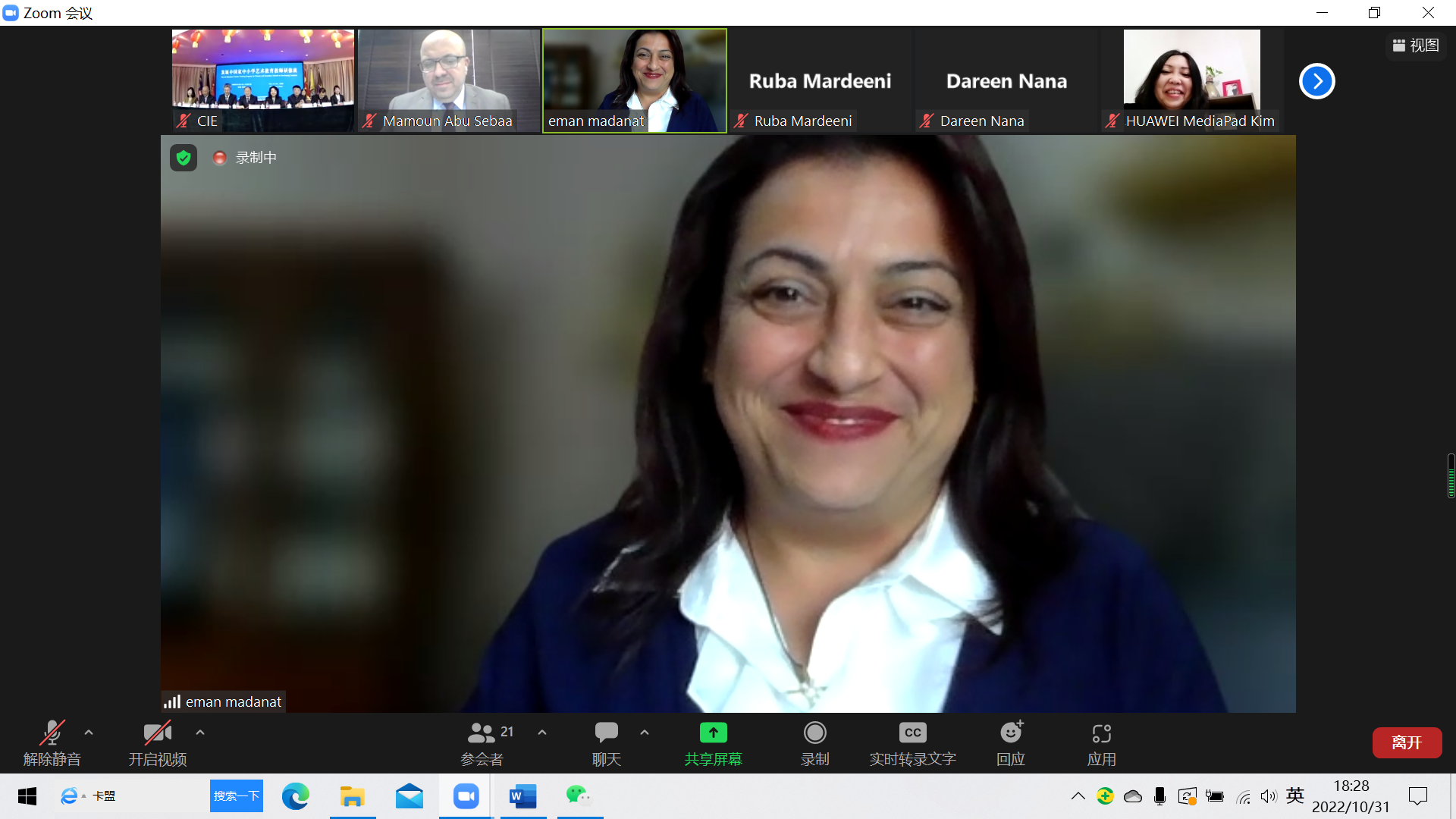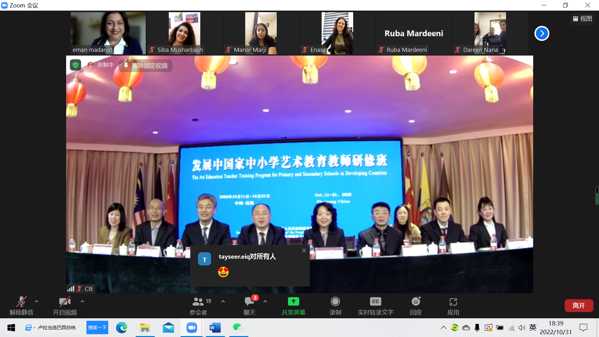 约旦学员代表Eman Madanat在仪式上发言。她表示,这是她第二次参加由太阳成集团tyc33455官方网站承办的商务部援外培训项目,本次研修班从课程的内容、授课形式到活动的组织都是由深入浅、易于学习并理解,在艺术公司产品教法的分享与交流中,大家深刻感受到了中华传统文化的魅力。