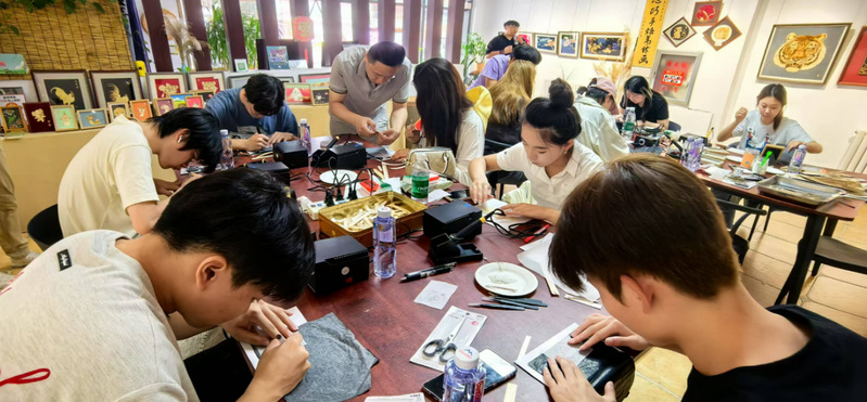 6月17日,团队前往市级非遗保护项目盘锦苇艺非遗工坊。市级传承人张守波老师细致讲解芦苇画从选材、处理到设计、绘制,再到粘贴、装裱的制作工艺,并亲自示范。同学们结合舞台美术专业特长,融入现代设计理念,发挥想象力和创造力,创作出兼具艺术性与实用性的芦苇画作品,为传统工艺注入新活力。